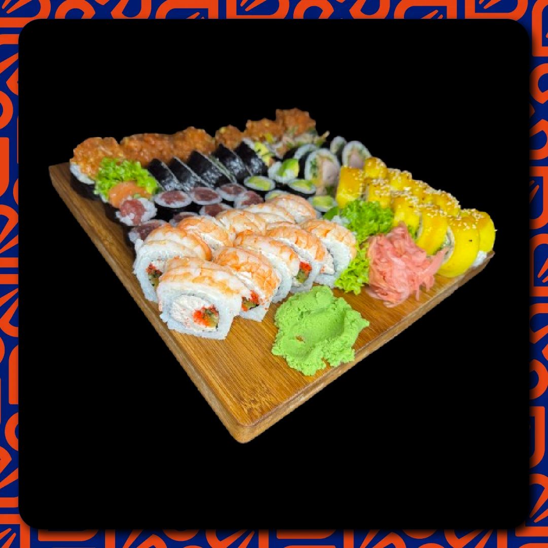 2) Futomaki krewetka w tempurze, majonez pikantny, warzywa, na wierzchu tatar z łososia – 6 sztuk
